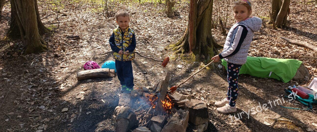 Toto miesto poznám z môjho túlania na bicykli a tak som sa sem vybral aj s deťmi. Nabalili sme sa špekačkami, zeleninou a niečím na pitie a šup na bicykle. Ako skončila cesta, trasa ide hore lúkou – toto ale deti nedali, lebo je to moc prudké a tak sme si ich všetci pekne vytlačili hore až k ohnisku.