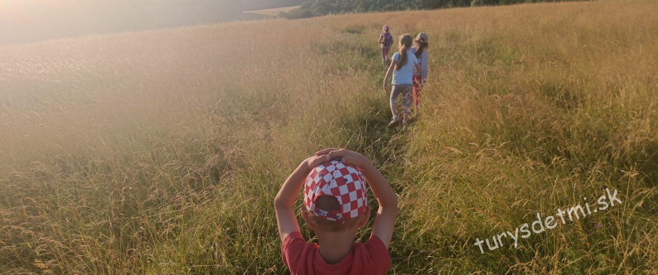 1. deň sme dve partie vyrazili kúsok skôr a zastavili sme autá nad Vrútkami. Dali sme rýchly obed zo zásob z domova, našli pár krabičiek a počkali sme pod Višňovským tunelom na tretiu partiu. Odtiaľ bol plán ísť na jednoduchý výlet so spestrením – malá jaskyňa a zlaňovanie zo skaly. Po dvoch lúkach sme si to vykračovali zarasteným lesom, na miesto, kde má byť jaskyňa – tá tam aj bola, ale zavalená, nebolo možné ju pozrieť. Pokračovali sme teda do kopca ku skale, kde sa malo zlaňovať. Plánoval som so sebou zobrať aj deti na lano, ale na mieste sa plány zmenili, pretože skala bola lámavá, samá hlina a porast. Na svoj „zlaňák“ im vyberiem krajšiu skalu. Odtiaľ sme všetci strminou pokračovali na poľnú cestu a po nej až k autu. Potom sme sa už presunuli do kempu, našli miesto pre tri stany a tri autá. Po postavení stanov sme sa ešte večer vybrali na jednu prechádzku na kopec Stráne. Cesta podvečer bola zaujímavá – slnko bolo nízko a lúka k klasmi tráv vysokými ako deti náš šteklila po celý čas.