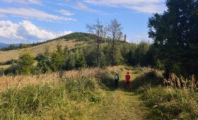 Boli sme v týchto končinách len nedávno, ale našiel som tu ešte jedno miesto, ktoré stojí zato si ho pozrieť. Tak ako minule, zaparkovali sme blízko prameňa vajcovky, ale aby to dnes nebolo úplne jednoduché, vybrali sme sa po lúkach smerom nahor. Sú tu pekné výhľady na okolité kopce, stúpanie nebolo náročné a za chvíľu sme boli navrchu pod lesom. Pokračovali sme po lúke ďalej, neskôr sme sa na chvíľu napojili na červenú TZ, ktorú sme ale po chvíli opustili a pokračovali opäť po lúkach. Odbočili sme aj z plánovanej cesty a vyskúšali jeden poľovnícky posed. Odtiaľto sme prešli cez malý kopček, brodili sa lístím a napojili sme na cestičku ku krížu. Cestičkou sme šli nadol až pod menšie stúpanie tesne pred krížom. Navrchu je parádna výhľadová hojdačka a lavička. Kríž je kúsok nižšie. Deti sa tu zabavili zbieraním malých ulít a samozrejme všetci vyskúšali hojdačku. Spravili sme nejaké foto a pobrali sme sa k autu a ďalším cintorínom naplánovaným na dnešný deň…